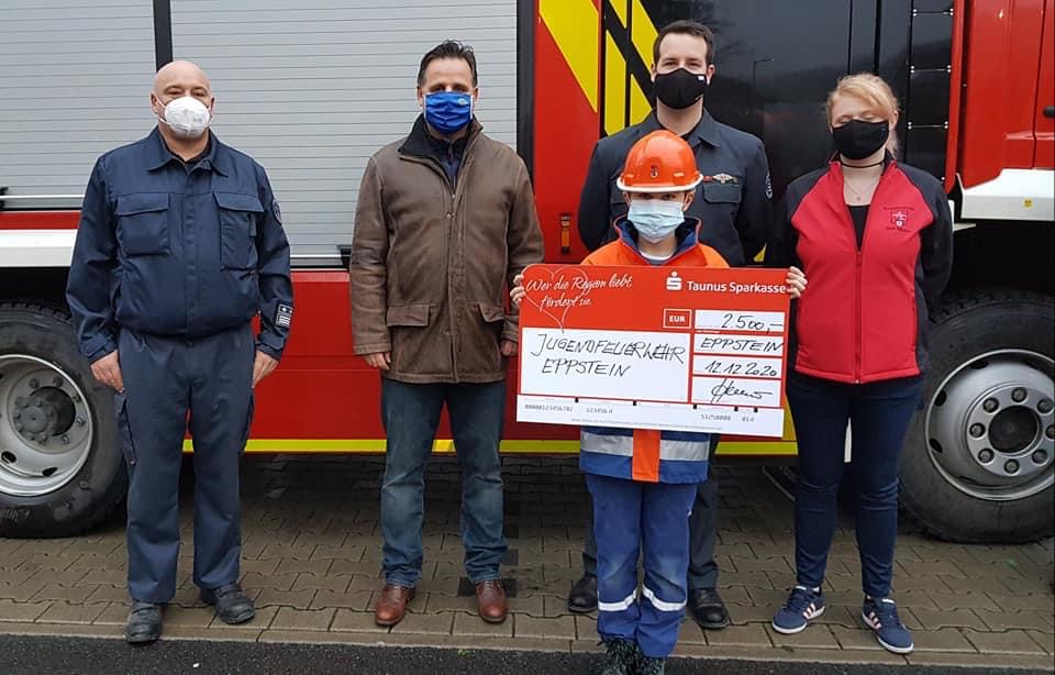 Die Ausrückeordnung wurde dementsprechend angepasst. Besonders die Kinder- und Jugendfeuerwehren leiden unter den Einschränkungen. Die regelmäßigen Treffen an Unterrichtstagen- und Abenden fallen gänzlich aus. Mit verschiedenen Videokonferenzen versuchen die Jugend- und Kinderwarte sowie die Jugendleiter der Freiwilligen Feuerwehren Eppsteins, den Kindern und Jugendlichen eine Perspektive aufzuzeigen und eine „neue Normalität“ zu schaffen. Die allseits beliebte Weihnachtsbaum-Aktion der Jugendfeuerwehren kann aufgrund der aktuell angespannten Lage leider dieses Mal nicht stattfinden. Die Kinder und Jugendlichen sind darüber besonders enttäuscht, so konnten sie sich doch in den vergangenen Jahren mit Ihren Spenden bei der Abholung der Weihnachtsbäume einiges für das Zeltlager und gemeinsame Aktivitäten dazuverdienen. Dank des LIONS Clubs Eppstein konnte bereits ein Teil des finanziellen Schadens aufgefangen werden: Für die Stadtjugend- und Kinderfeuerwehren spendeten die Mitglieder bereits 2.500 €. Somit kommen pro Wehr 500 € in den Spendentopf. Eine kleine Delegation konnte den Scheck coronakonform entgegennehmen und bedankte sich für die großzügige Aufwendung.